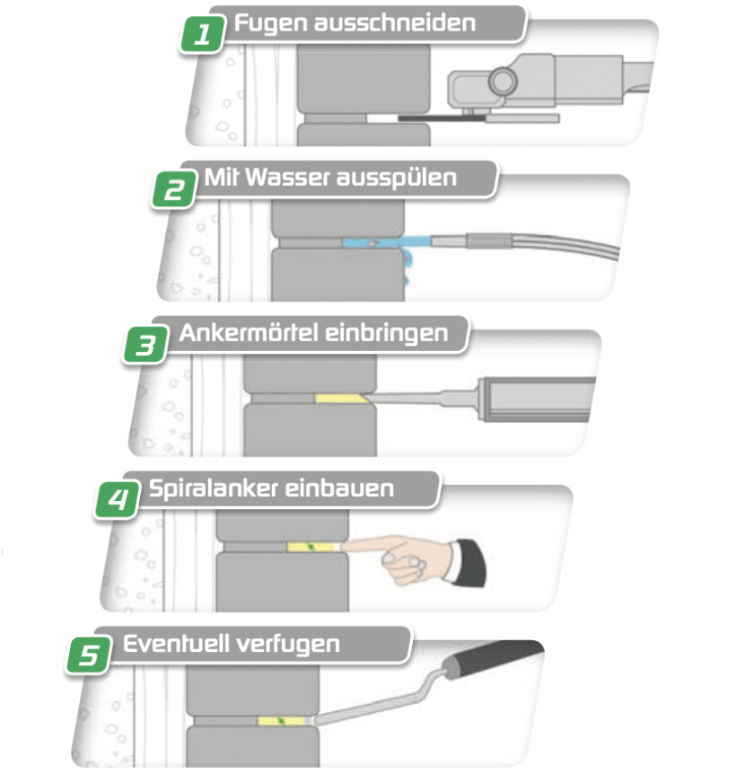 Sie überbrücken den Riss und verbinden die beiden Rissufer, sodass die entstehenden Zug- und Spannungskräfte vom Anker übernommen werden und eine erneute Rissbildung verhindert wird.